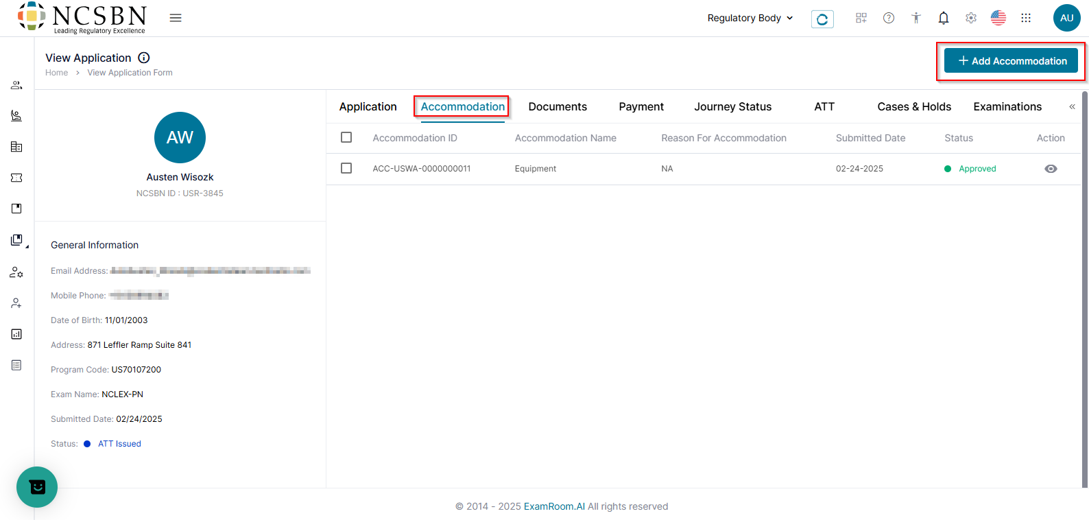 - On the View Application page, click the Accommodation tab, then click +Add Accommodation to add accommodation(s) for the candidate.