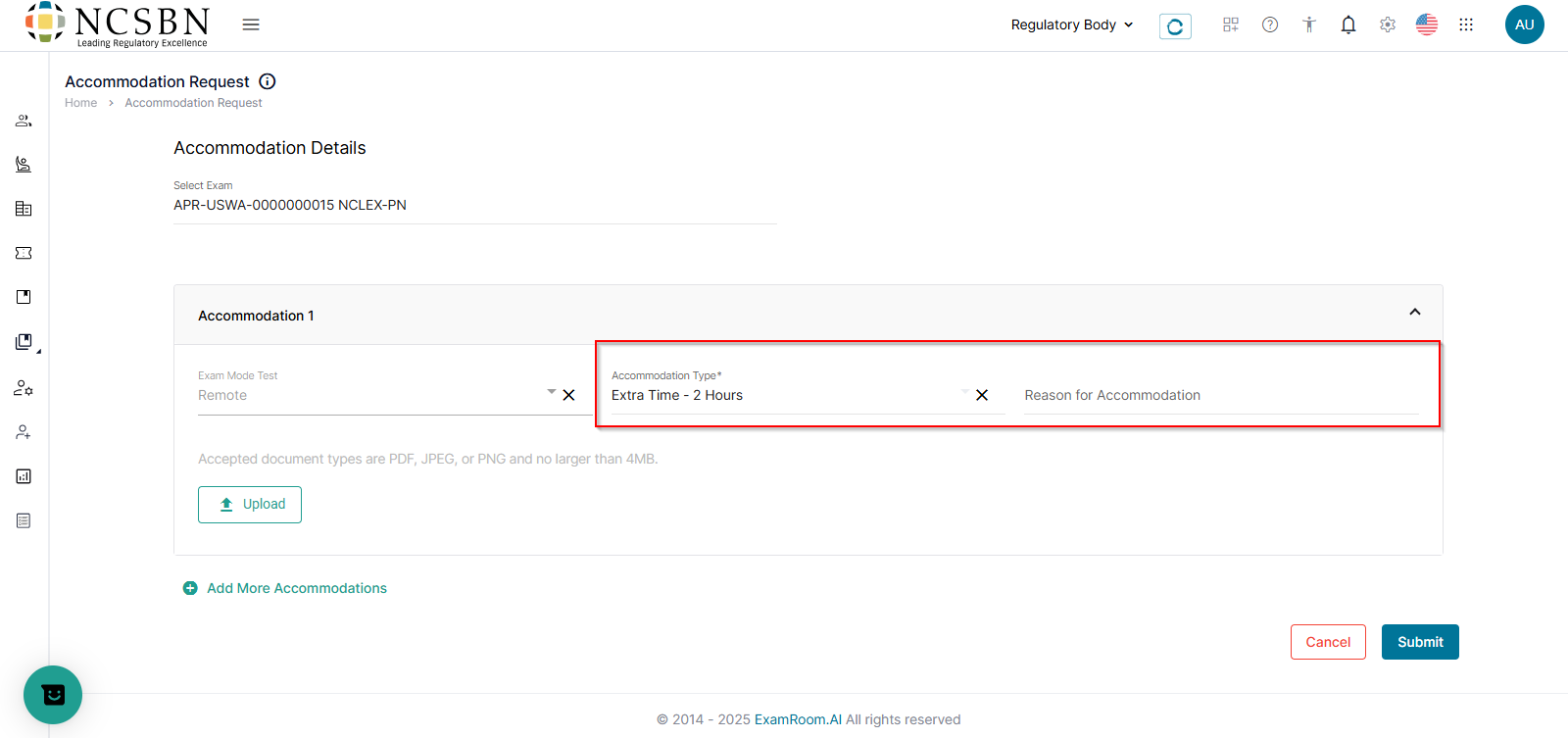 - Click Submit to save and submit the accommodation or click Cancel to discard the changes and exit.