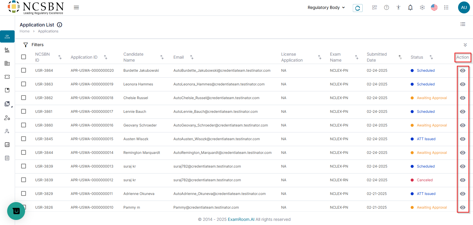 - In the Actions column, click the View icon to add accommodation/s for a candidate.