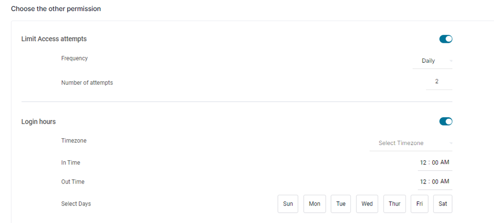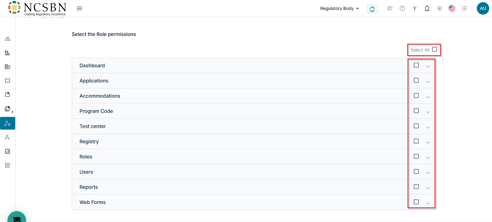 - In the Select the Role Permission section, Select All to provide access to all permissions, or select only the ones you want the user to have.