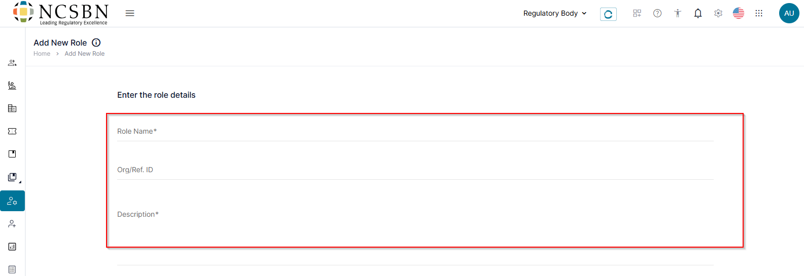 - In the role details section, enter the Role Name, Org/Reg. ID, and Description.