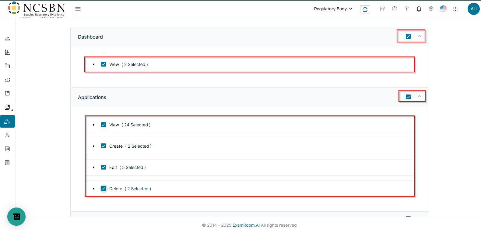 Note: Each role permission has additional sub-permissions, such as View, Create, Edit, and Delete. Clicking Select All grants permission to all sub-permissions.